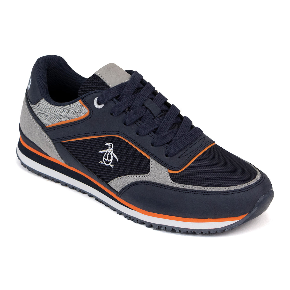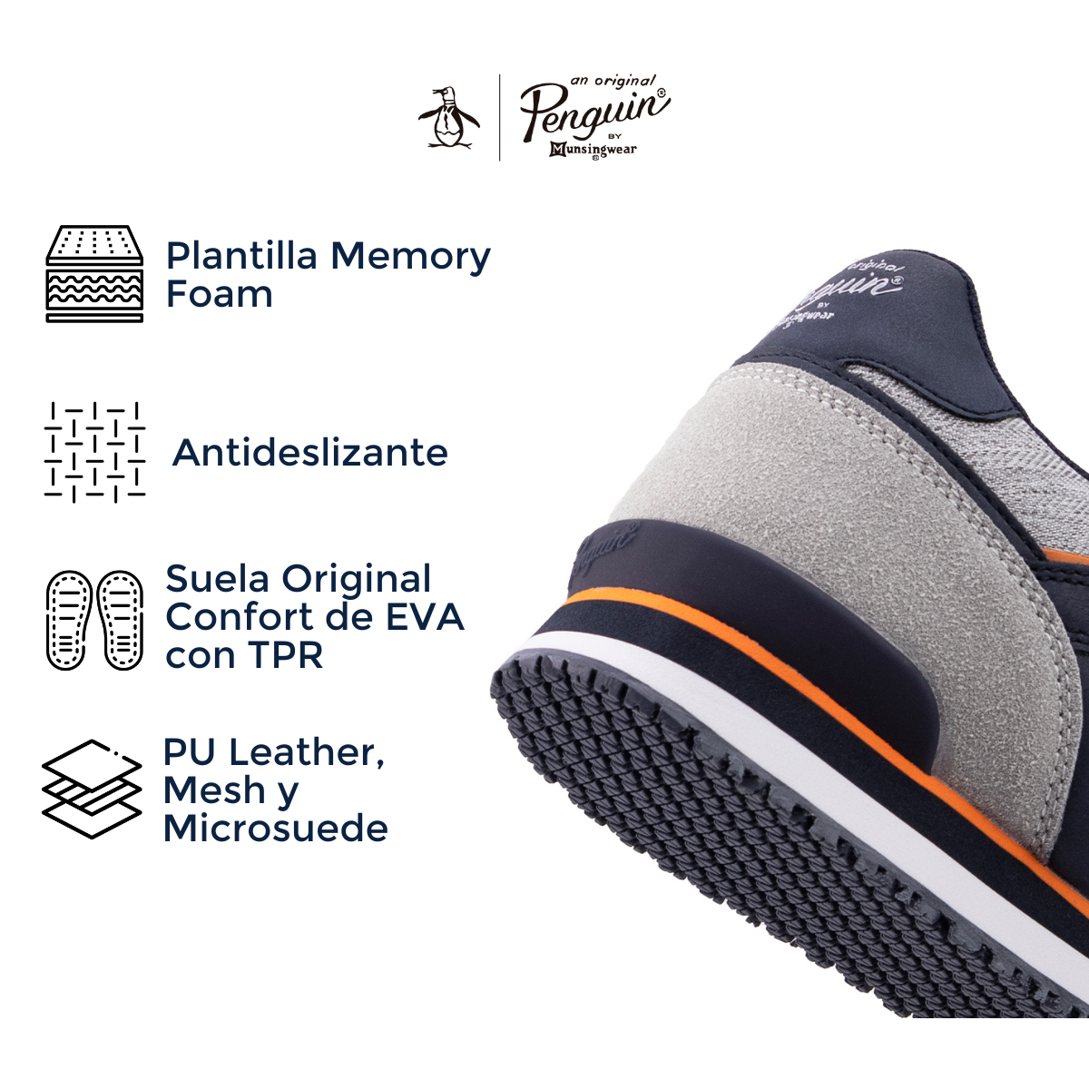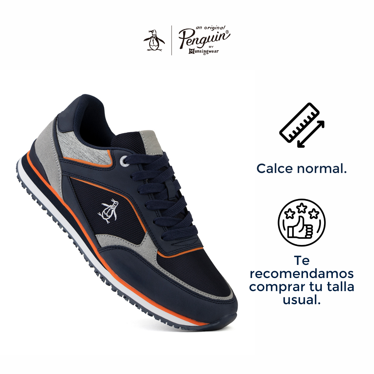 Los Tenis Style Bower de Original Penguin están marcados con el distintivo Pete de la marca. Fabricados con paneles de PU Leather, Mesh y Microsuede en azul marino, una suela Original Confort de EVA con TPR antideslizante, que volverá tus paseos más cómodos.