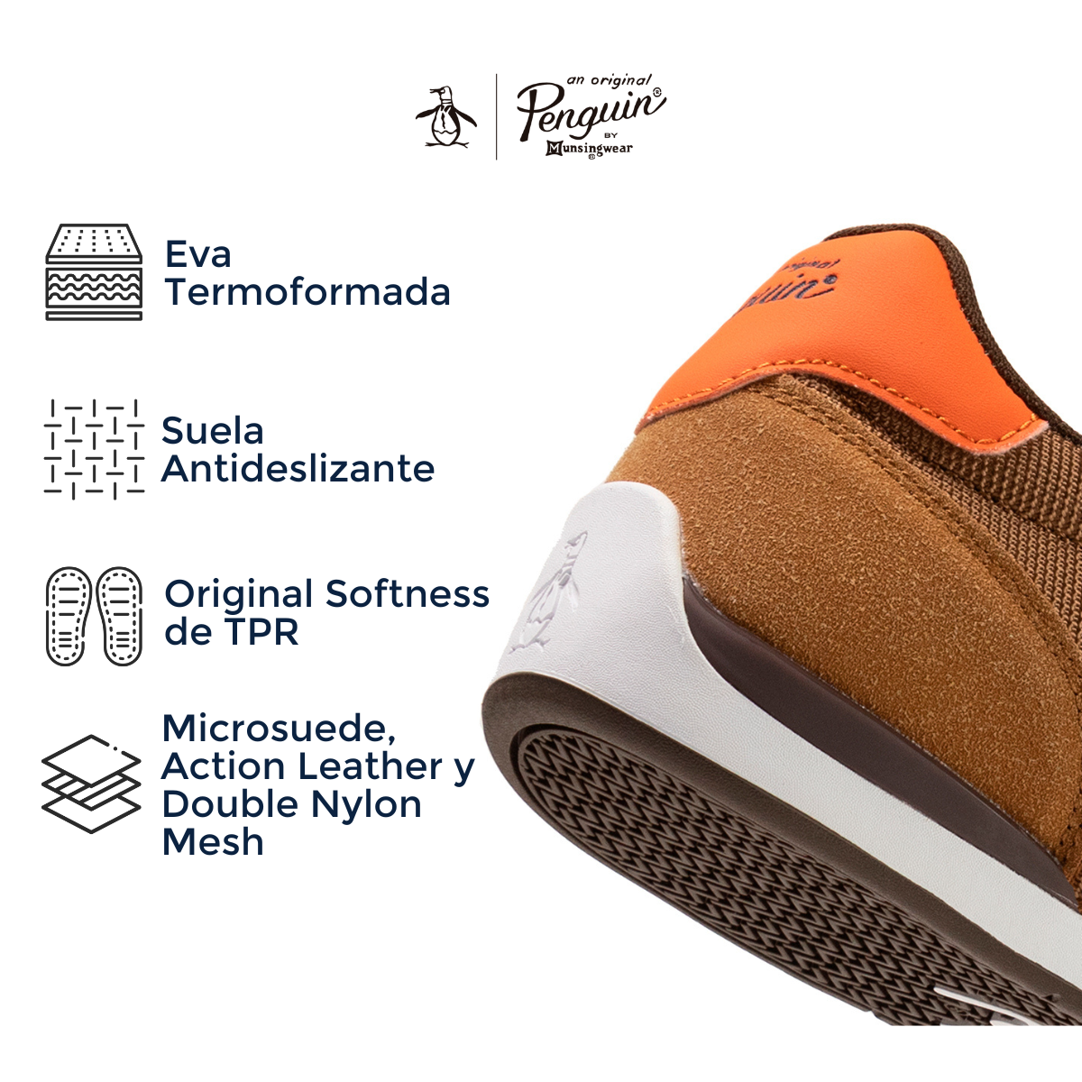 Los Tenis Style Jason de Original Penguin están confeccionados con paneles de Microsuede, Action Leather y Double Nylon Mesh en tonos cafés, montados sobre la suela Original Softness de TPR, con plantilla de EVA termoformada. Dale a tu estilo casual un toque de formalidad.